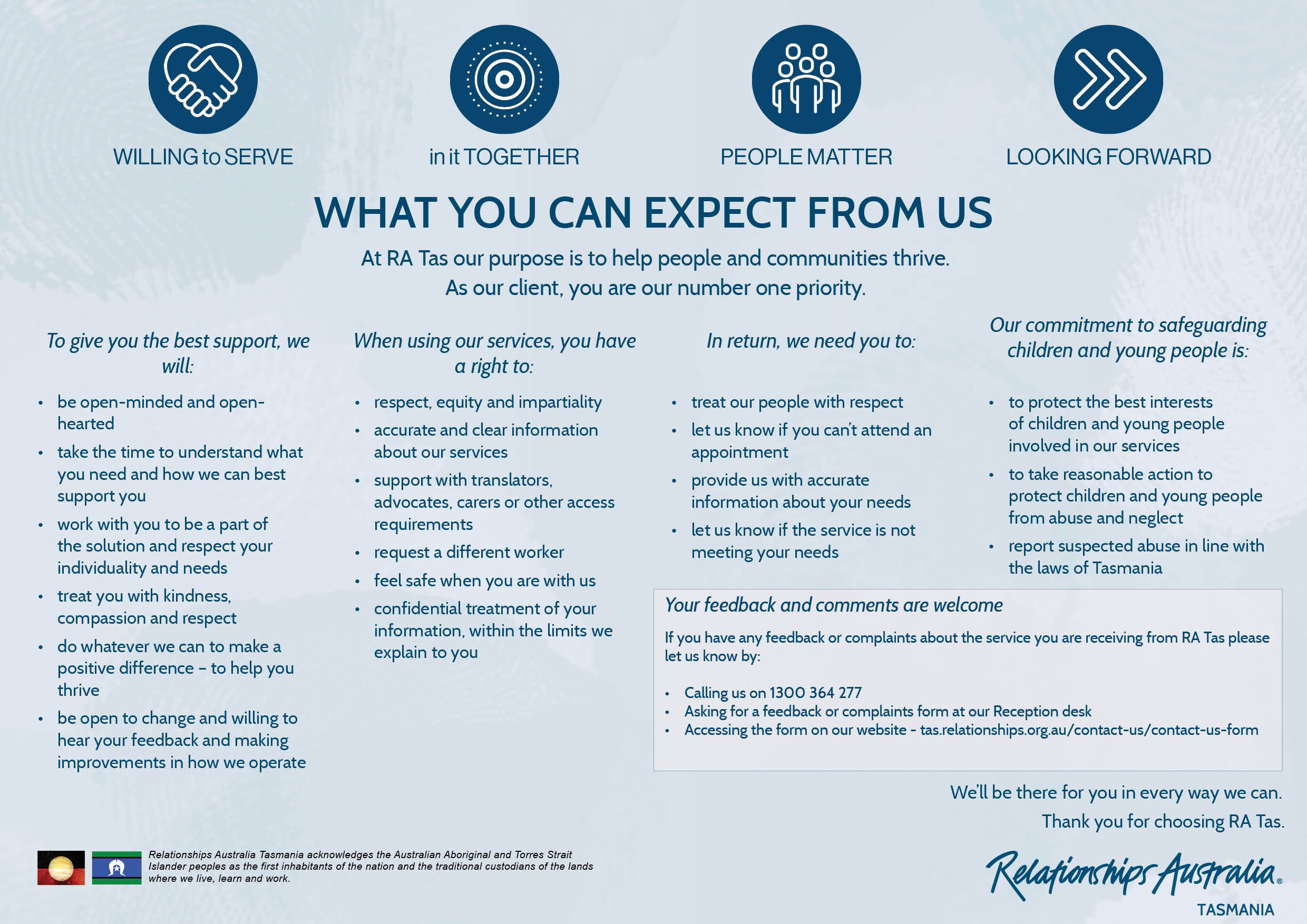 Our staff follow the RA Tas Code of Ethics and a clear Code of Conduct to make sure you are treated with respect, care, and professionalism. You can view the full Code of Conduct by clicking the link below.